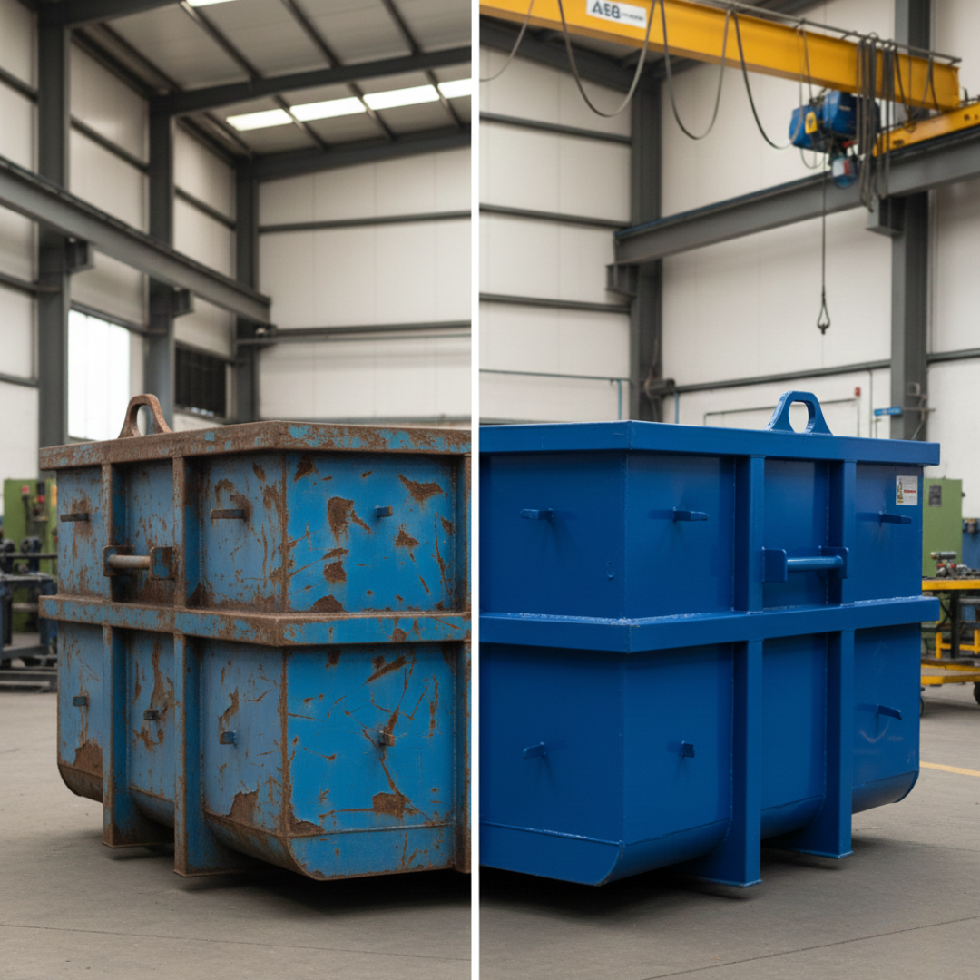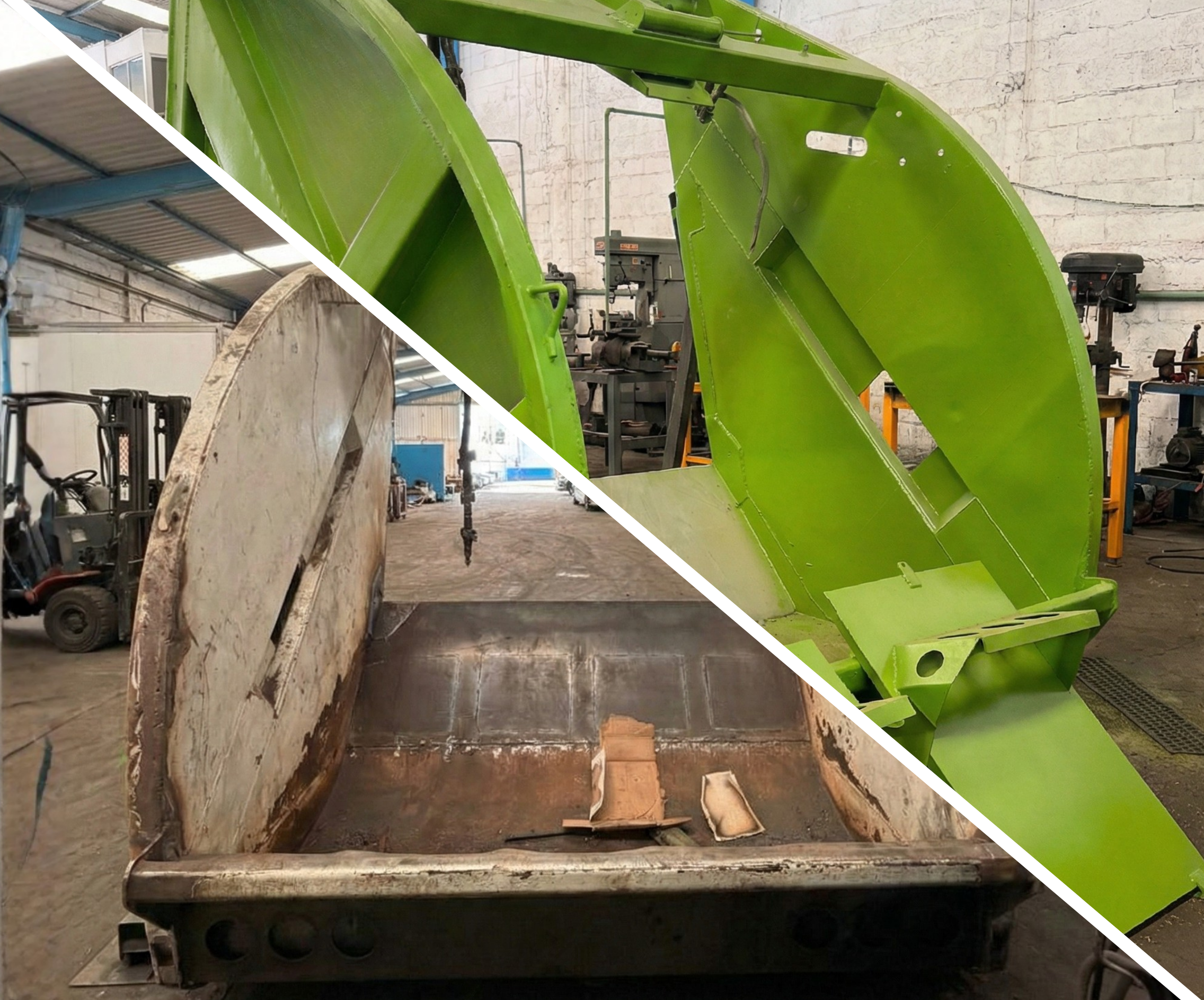 Reparación y fabricación de tolvas metálicas para manejo de residuos y materiales a granel.